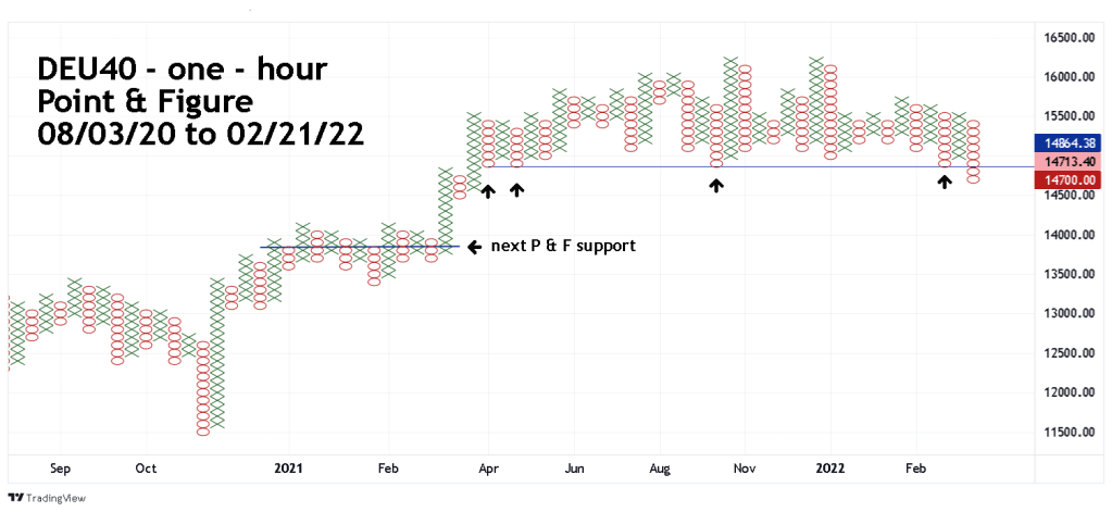On 02/21/22 the DEU40 had a decisive break below important support and implies a drop to at least the next Point & Figure support at 13850. If that support level is broken the DEU40 could decline to a Fibonacci .382 retrace of the bull move that began in March 2020.