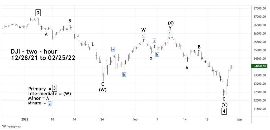 The two – hour DJI chart courtesy of Trading View illustrates a detailed Elliott wave count.