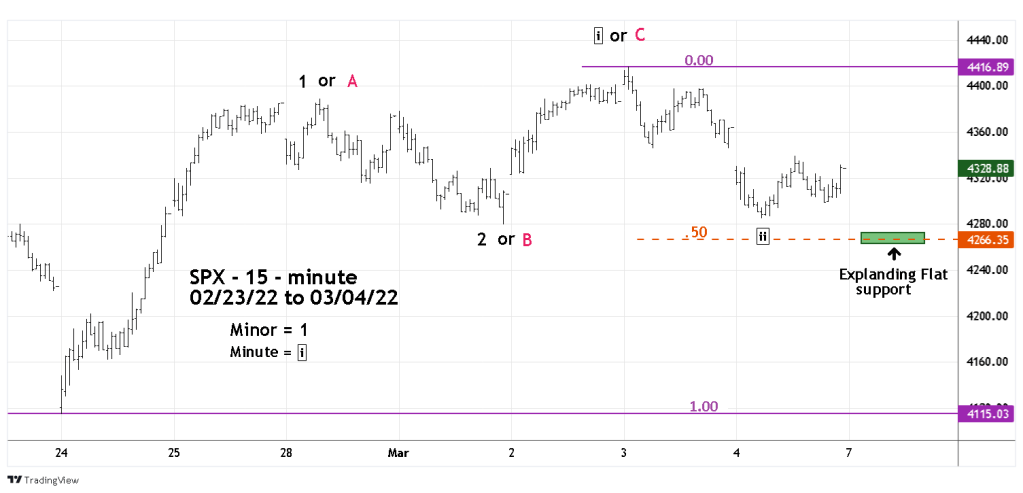The US stock market as measured by the S&P 500 (SPX) has three potential Elliott wave counts. The 15 – minute SPX chart courtesy of Trading View illustrates the action after the 02/24/22 bottom.