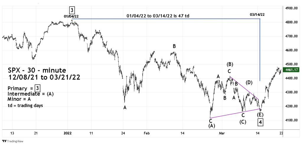 There’s a very high probability that a post Horizontal Triangle wave thrust up is under way from the 03/14/22 bottom and could reach its termination point by late April/early May 2022.