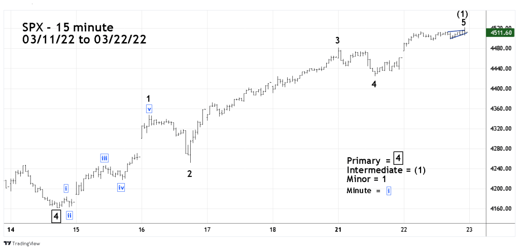 The 15-minute SPX chart courtesy of Trading View illustrates the short -term Elliott wave count.