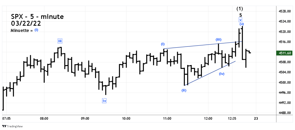 The 5 – minute SPX chart provides additional Elliott wave evidence.