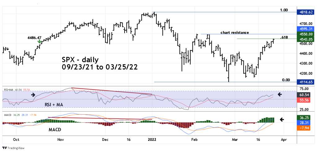 The SPX is nearing the Fibonacci .618 retracement level of the 01/04/22 to 02/24/22 decline. Just above that is chart resistance at 4595. It’s possible another short-term peak could be made in this resistance zone – however, stay focused on the bigger picture.