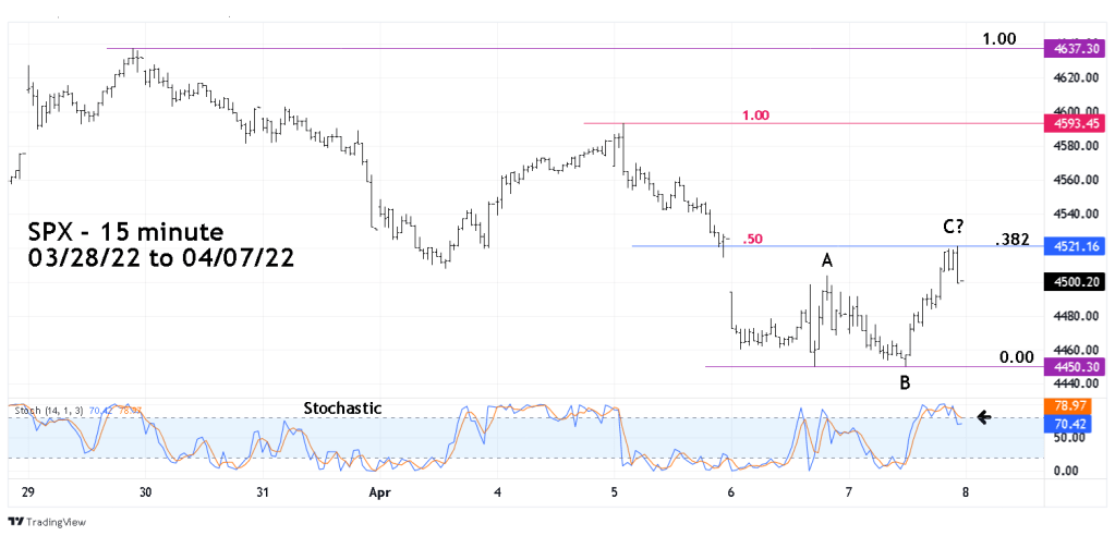 The subsequent rally peaked at 4521.16 almost a bulls eye hit of the Fibonacci .382 retracement of the 03/29/22 to 04/06/22 decline.  The exact .382 level is 4521.57.