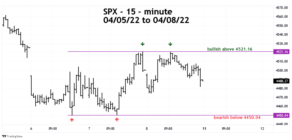 The 04/07/22 blog “Rally into Resistance” noted the test of the prior day low and the subsequent rally into two Fibonacci resistance points at 4521.57 and 4521.74. The SPX high on 04/07/22 was 4521.16. The next trading day – 04/08/22 the SPX high was 4520.41 creating a double top.