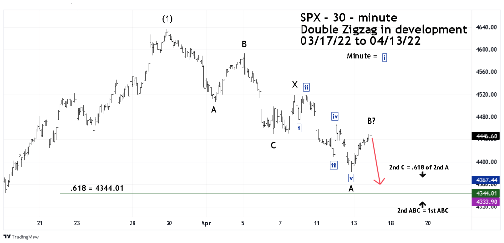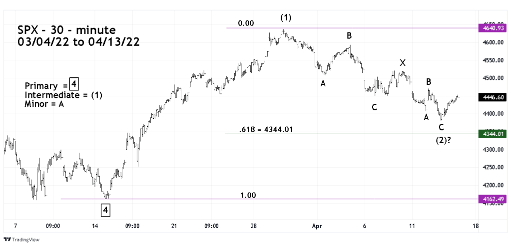 The first 30-minute SPX chart courtesy of Trading View illustrates a completed Double Zigzag at the 04/12/22 bottom.