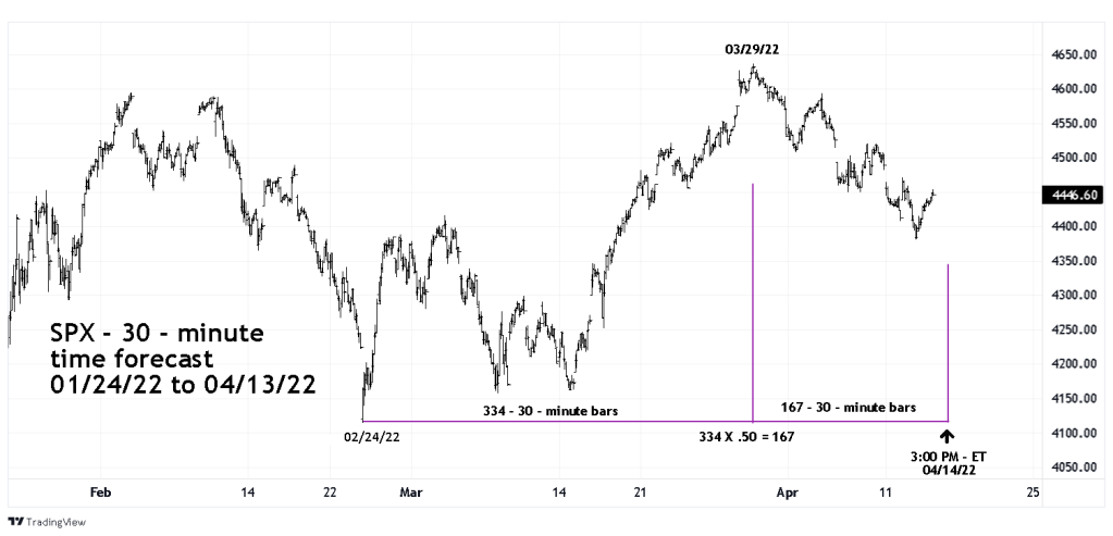 Using the two most significant turn points of the prior two months reveals that the SPX 02/24/22 to 03/29/22 rally lasted 334 – 30 – minute bars multiplied by .50 equals 167 – 30 – minute bars. 167 – bars after the 03/29/22 peak targets a presumed bottom at 12:00 PM – ET on 04/14/22.