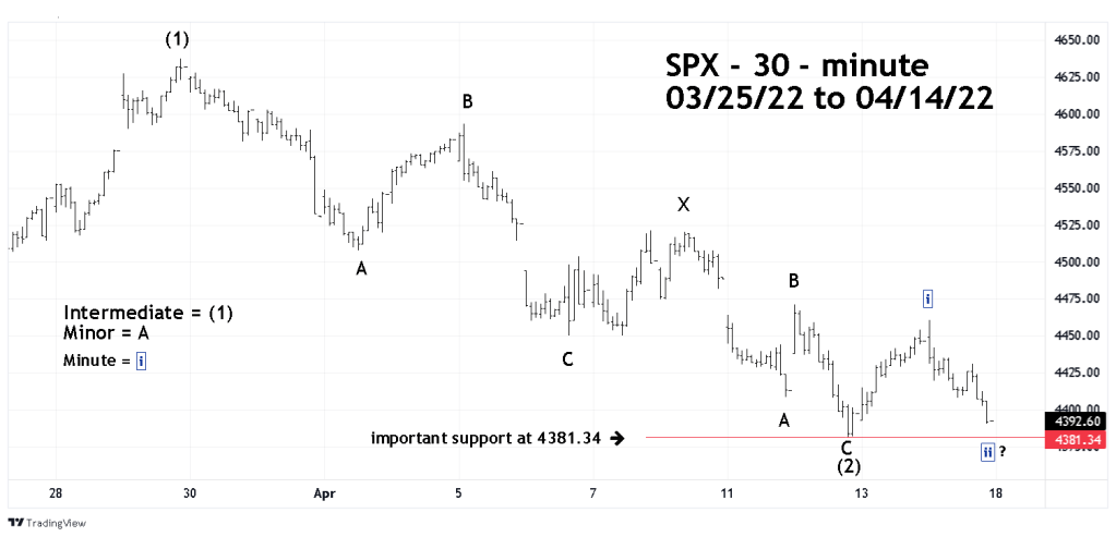 The 04/13/22 blog “Short – Term Bottom Forecast” illustrated two possible SPX Elliott wave counts. One count had the Double Zigzag correction completing at the 04/12/22 bottom. The other had the Double Zigzag completing below the 04/12/22 bottom possibly in the area of SPX 4333 to 4367.