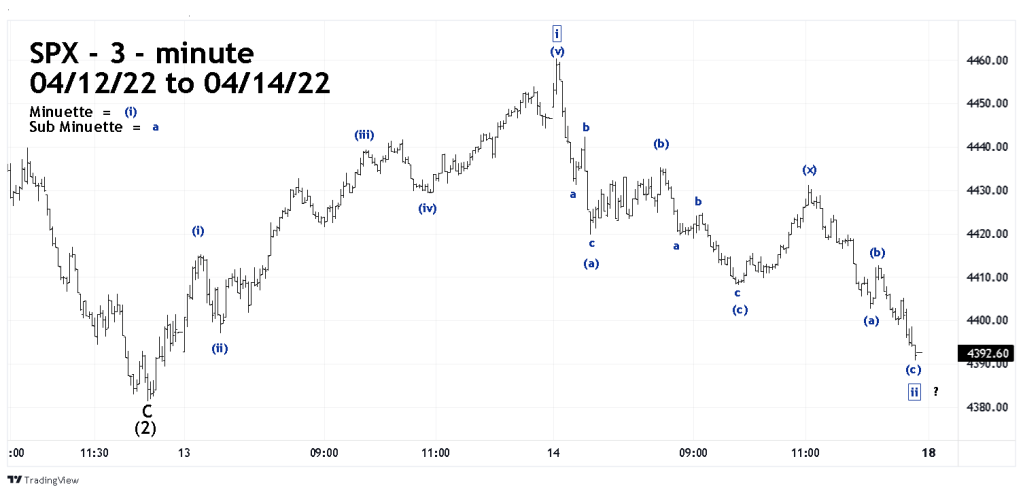 The SPX – 3 – minute chart zooms in on the very short-term Elliott wave count.