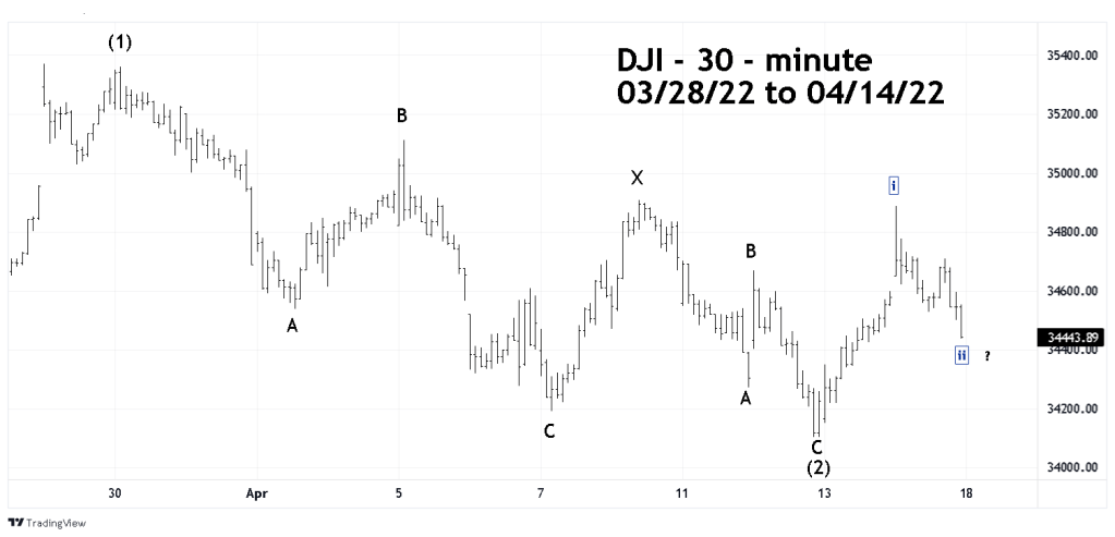 The Dow Jones Industrial Average (DJI) – 30-minute chart illustrates its intraday Elliott wave count.