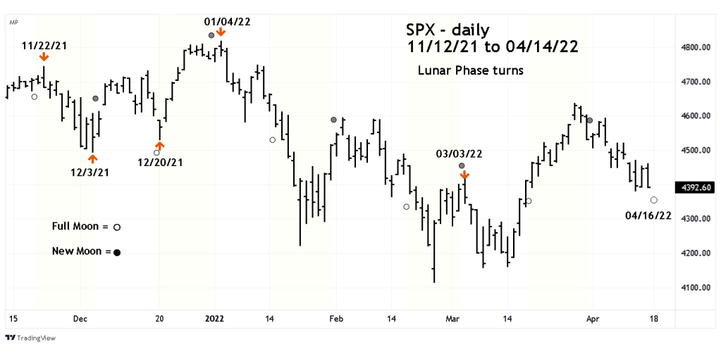 The daily SPX chart courtesy of Trading View illustrates the Full and New Moons since November 2021.