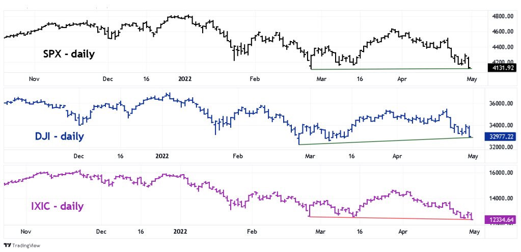 The daily SPX,DJI, and IXIC chart courtesy of Trading View updates the price action of these indices that was illustrated in the 04/28/22 blog “Examination of the Weakest US Stock Index”.