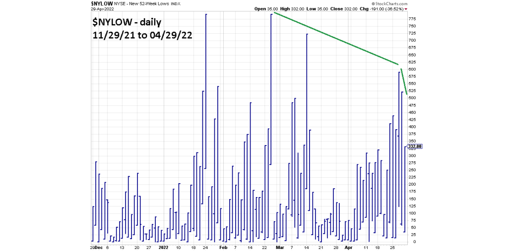 As the Nasdaq goes lower, there are less stocks making new – 52 – week lows. This phenomenon continued into 04/29/22 with less new lows than were recorded at the 04/27/22 bottom.