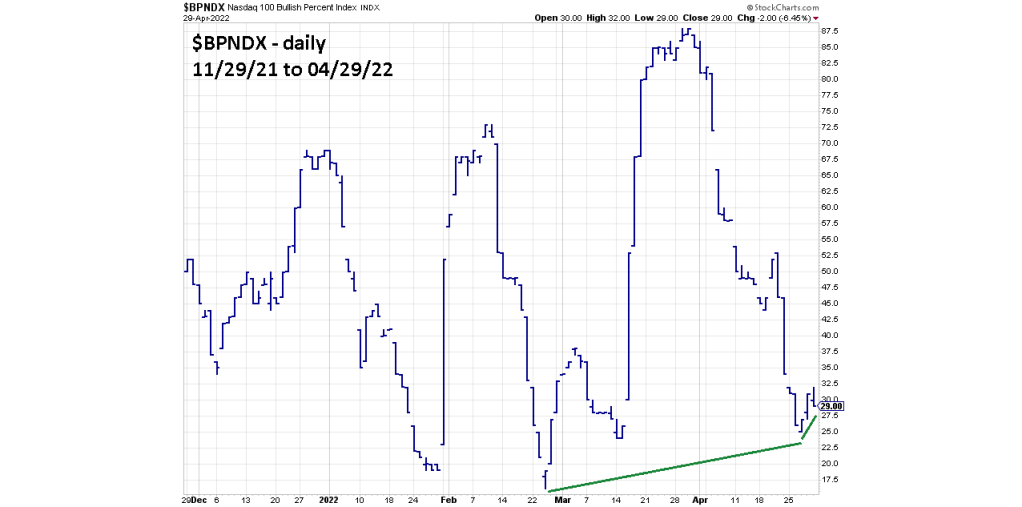 The daily Nasdaq 100 – Bullish Percent Index chart ($BPNDX) shows intermediate and short-term bullish divergences.