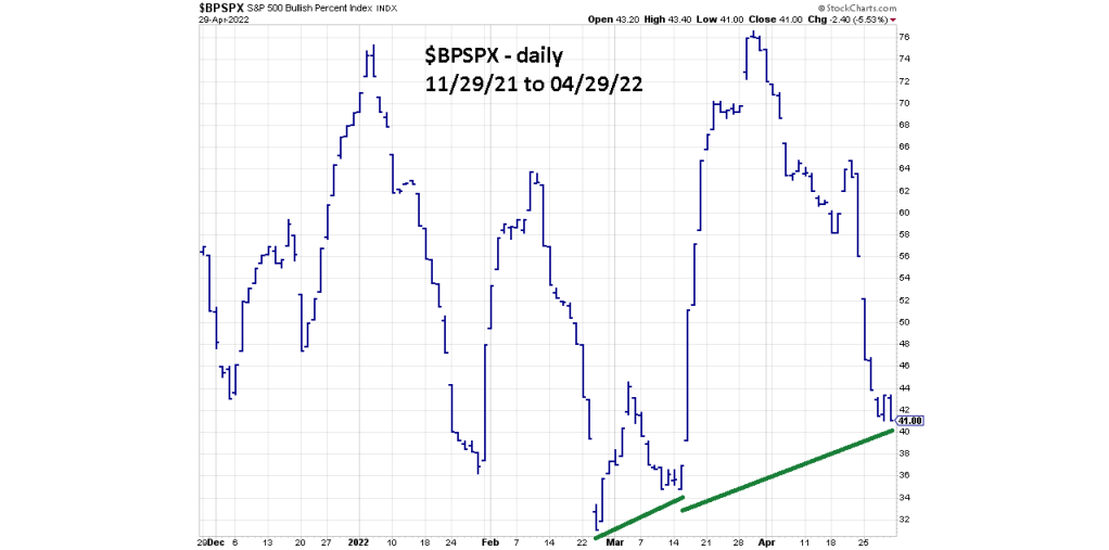 On 04/29/22 $BPSPX went marginally below its 04/27/22 reading . However, there’s a significant double bullish divergence vs. the readings made on 02/24/22 and 03/14/22.