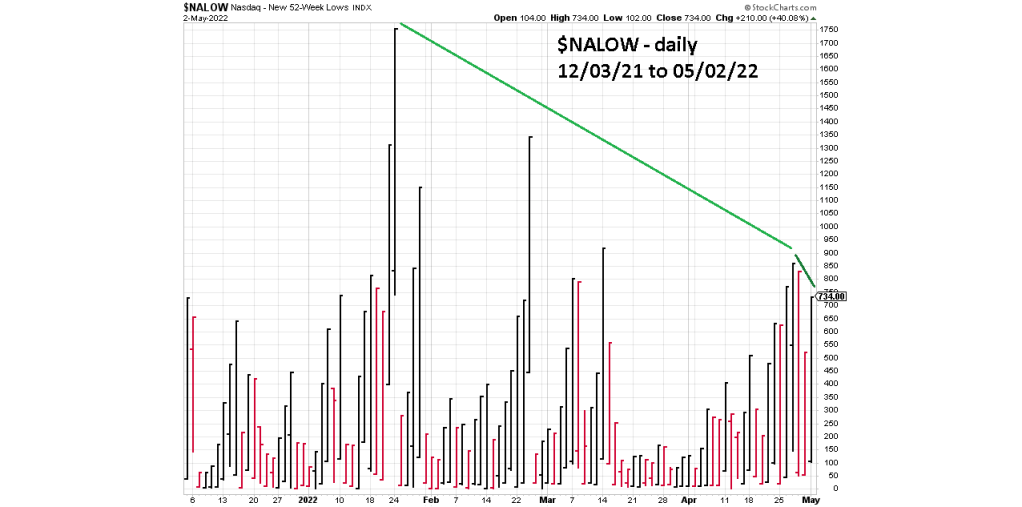 The daily Nasdaq New – 52 – Week Lows ($NALOW) chart courtesy of StockCharts.com updates the action of this internal momentum indicator.