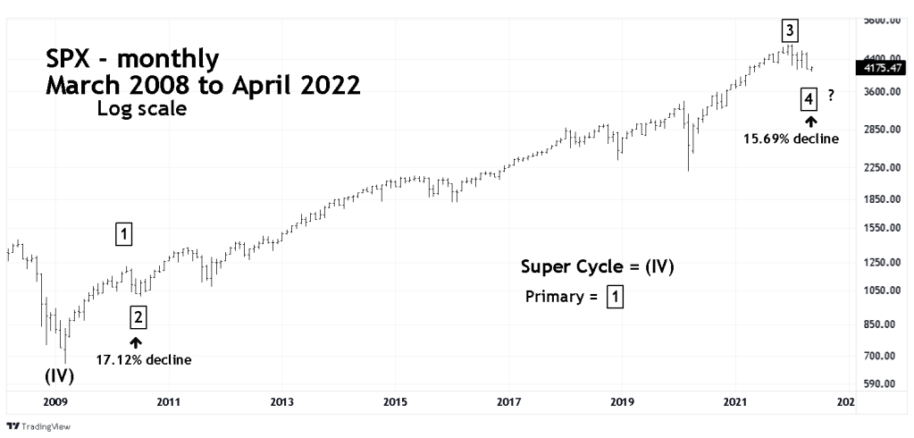 The monthly SPX chart courtesy of Trading View illustrates the long- term Elliott wave count.