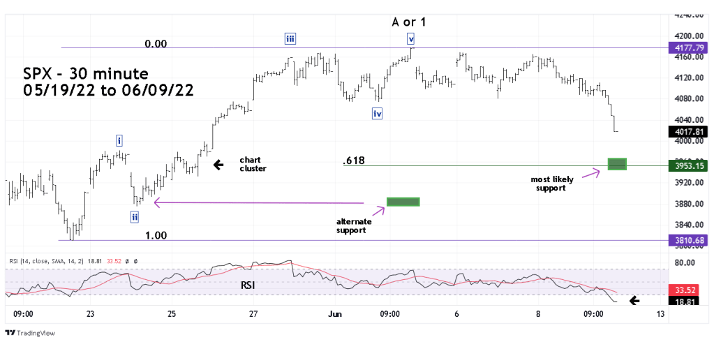 This chart updates the SPX 15 – minute chart illustrated in the 06/04/22 blog “Three Possible Paths for the S&P 500”. That chart showed a moderate bearish Elliott wave count. This wave count is the most likely scenario because of the briefness of the rally after the 05/20/22 bottom. The rally lasted only eight trading days, if a large SPX bear market is developing its likely more rally time is needed before the next major bear drop begins.