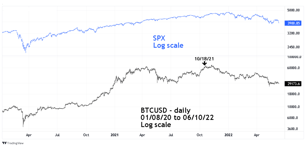 The daily S&P 500 (SPX) and Bitcoin in US dollars (BTCUSD) courtesy of Trading View illustrates their relationship.