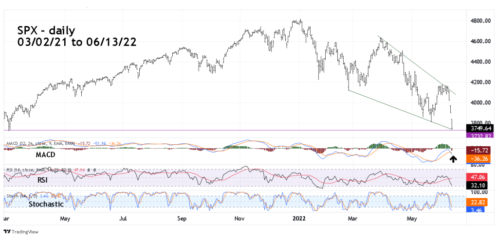 Today 06/13/22 the SPX low hit the lower declining trendline at 3734.30 slightly above chart support made on 03/05/21 at 3730.19.