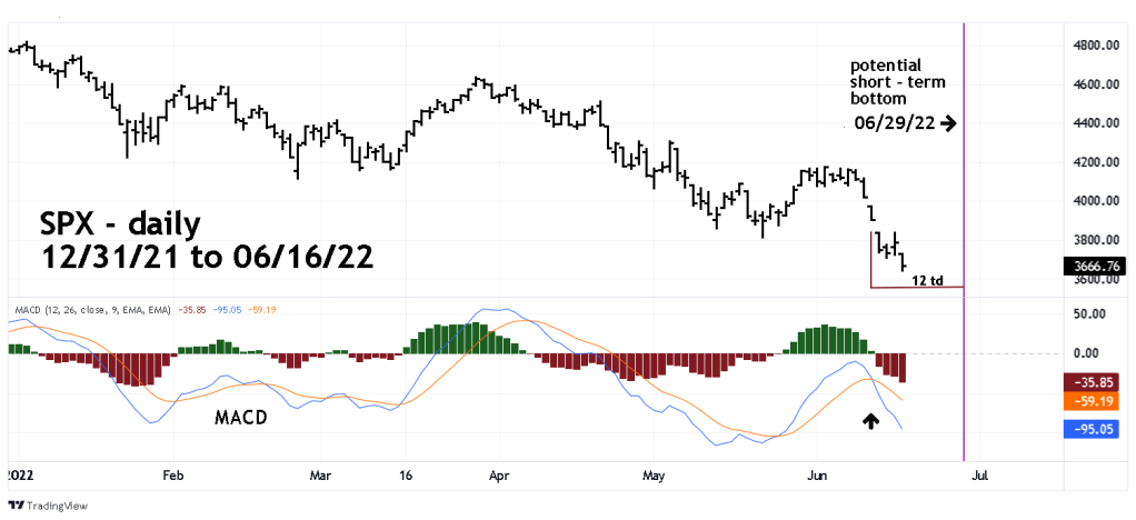 On 06/10/22 the S&P 500 (SPX) – daily MACD had a bearish lines cross over below the zero line. This is a rare event, the last time it happened was on 12/17/18, that occurrence could help to discover a short-term bottom for the current SPX decline.