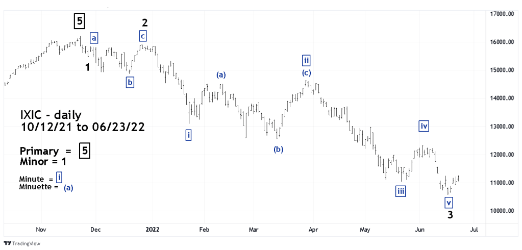 The 05/28/22 blog “Examination of Two Major Bear Markets” illustrated that the Dow Jones Industrial Average (DJI) decline from the January 2022 top appears to be taking the form of an Elliott wave – Double Zigzag. It’s possible the Nasdaq Composite (IXIC) drop from its all-time high is an Elliott five- wave Impulse pattern.