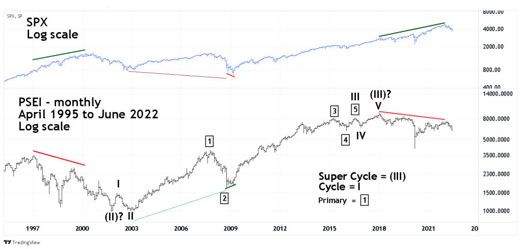 However, the PSEI had a significant bearish divergence vs. the SPX January 2022 top. It’s more likely that the PSE 2020 to 2022 rally is a countertrend move in an ongoing multi-year bear market.