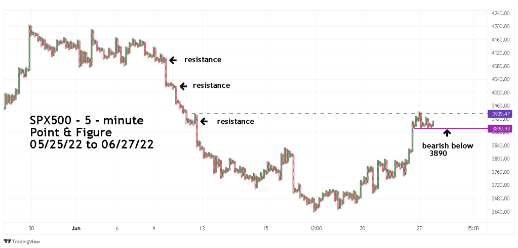 The 5 – minute SPX500 – Point & Figure chart courtesy of Trading View illustrates short – term support and resistance.