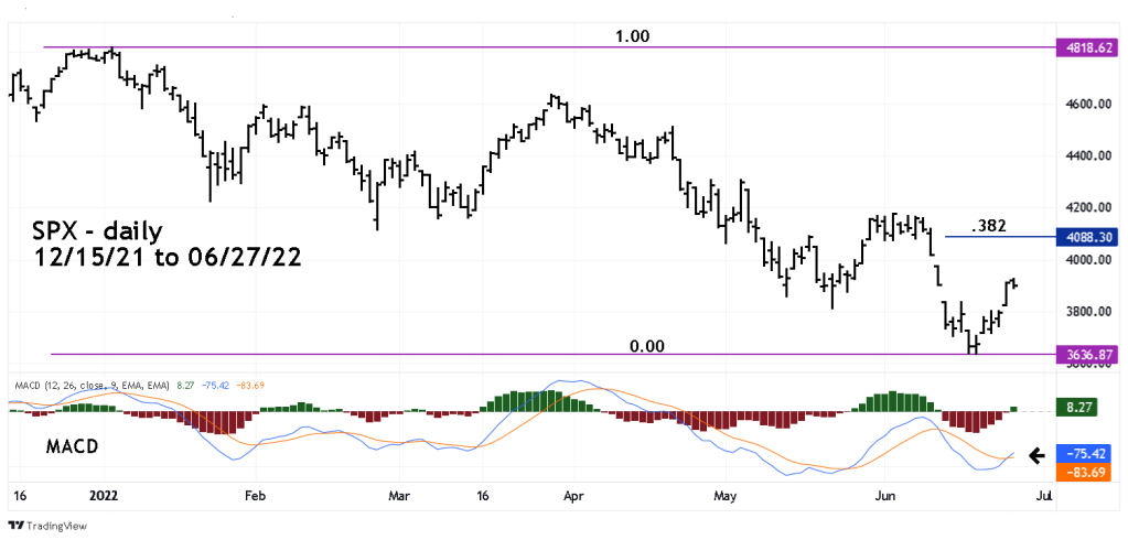 The 06/25/22 blog “Nasdaq Composite – MACD Indicator noted that the daily Nasdaq Composite (IXIC) had a bullish MACD lines crossover. Today 06/27/22 the daily S&P 500 (SPX) – MACD also had a bullish lines crossover. This increases the chances for at least a short-term US stock market rally.