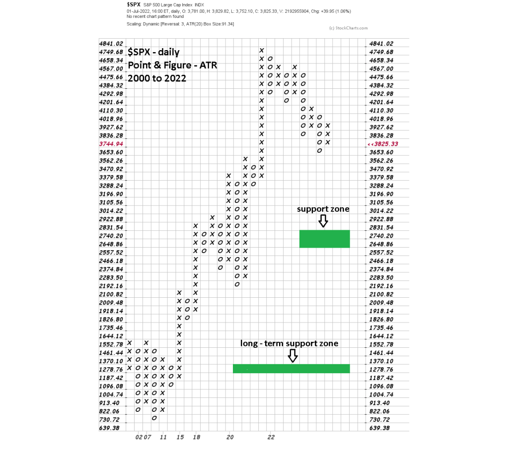 This PF chart uses the Average True Range (ATR) method and shows two potential support areas. Each has rows of seven columns . The first in the SPX 2,650 to 2,830 area could be reached later in 2022, possibly October based on seasonal patterns for US stocks.