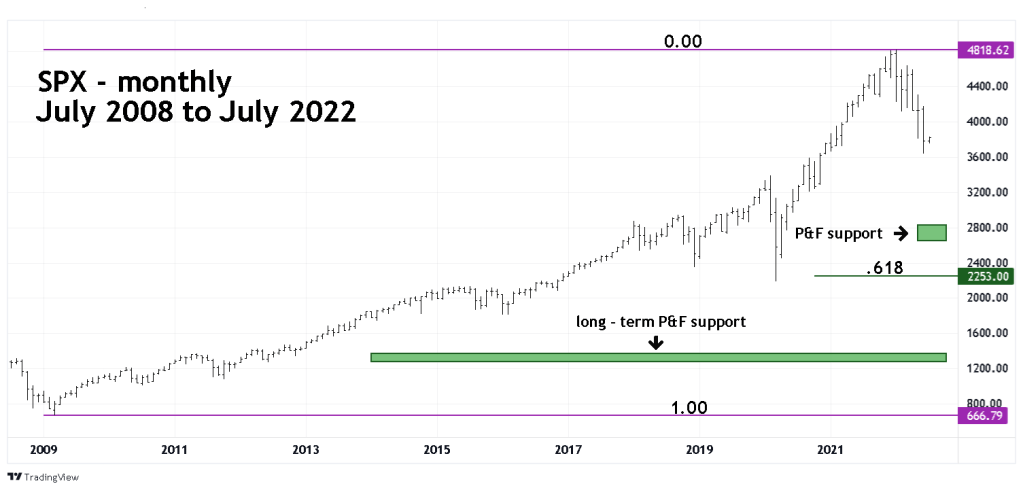 If the bear move that began in January 2022 continues and does not find support in the PF zone of 2,650 to 2,830, its possible it could reach the 2,200 area before the end of the year.