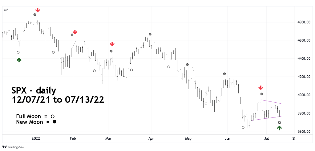 There’s a Full Moon on 07/13/22. The daily S&P 500 (SPX) chart courtesy of Trading View illustrates New and Full Moons since late 2021.