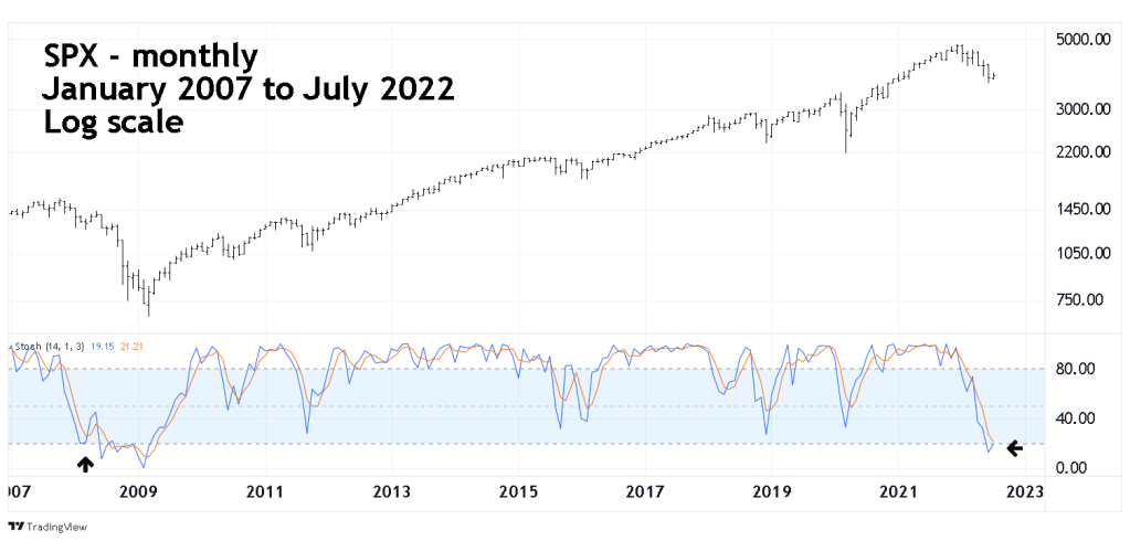 When trading and analyzing the markets we work with probabilities, not certainties. Near- term the SPX could make new 2022 lows pushing the monthly Stochastic deeper into the oversold zone. However, when you have one Stochastic line in the oversold zone and the other on the edge of oversold, the probabilities favor a bottom forming.