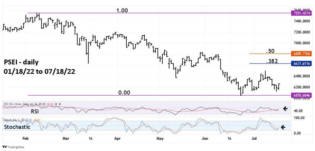In the short – term the Philippine Stock Exchange Index (PSEI) has been relatively weaker than the S&P 500 (SPX). The SPX recent bottom came on 06/17/22, the PSEI didn’t bottom until 06/23/22. On 07/15/22 the PSEI appeared to be on track to make a new 2022 low, the rally on 07/18/22 appears to have halted the decline.