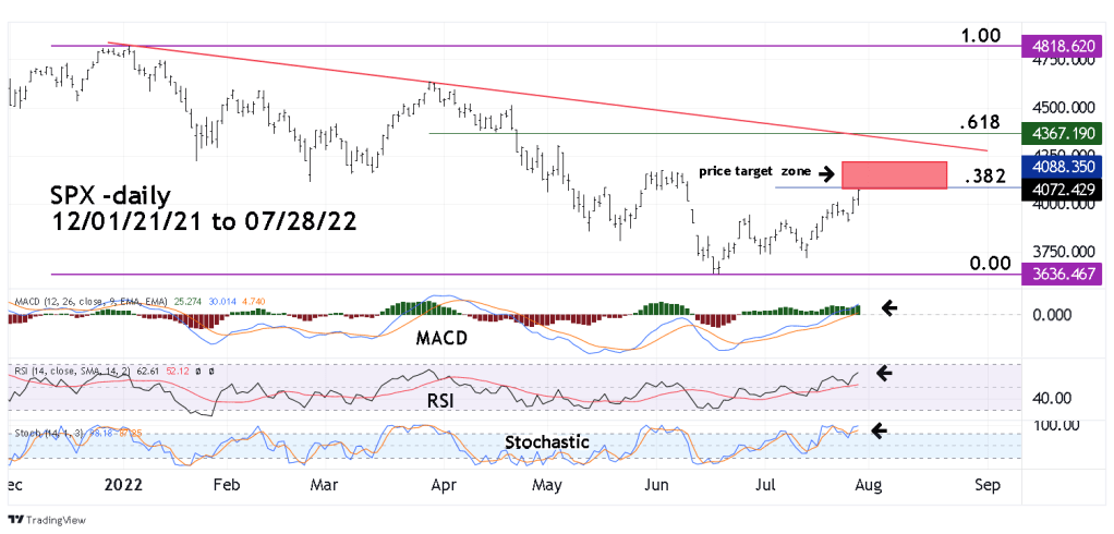 The SPX has reached the lower end of the price zone of 4080 to 4220 noted in the 07/23/22 blog “ S&P 500 – Momentum Update – 07/22/22”. If the SPX breaks above this zone – watch the declining trendline connecting the January and March 2022 peaks. If the SPX breaks above this trendline and above the .618 retracement level at 4367.00 it could open the door for a move back to 4800.