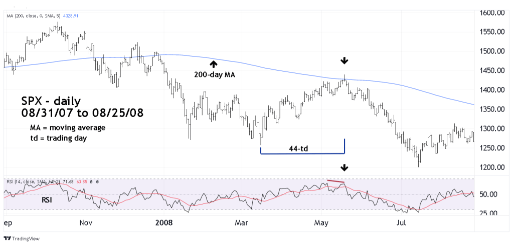 Note that the May 2008 top had an RSI bearish divergence. Also, note where the SPX was at the May 2008 top relative to the 200-day moving average (MA). A marginal breakthrough, then down.