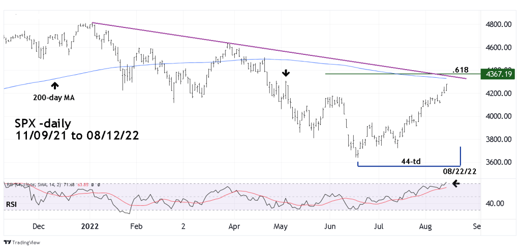 The March to May 2008 bear market rally was first mentioned in the 07/07/22 blog “Long – Term Momentum Implies a Multi – Week Rally. Subsequently there has been a multi-week rally. The March to May 2008 rally was 44 – trading days adding 44 trading days to the SPX 06/17/22 bottom targets 08/22/22 as a potential rally top.
