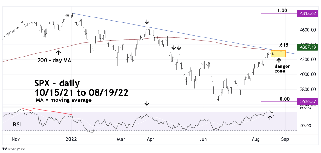 On 08/16/22 the SPX came  close to the declining  trendline and had a direct hit of the SPX 200-day moving average (MA).  Frequently in bear moves the 200-day MA will act as  resistance.  In this case right on cue, the SPX declined.  The start of a  large drop?  Perhaps, however the daily RSI hints at more upside action.