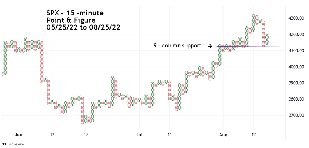 The 08/22/22 blog illustrated the Volume Profile method on the SP 500 continuous E-Mini contract. Using Point & Figure charting also shows a support level. Note that the SPX bottomed at 9 – columns of support.