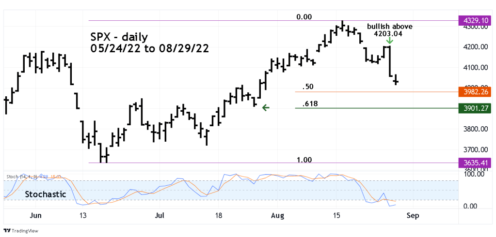 The Fibonacci .50 level is usually a weak support/resistance level. The Fibonacci .618 level is usually a stronger price magnet. In this case the .618 retracement of the SPX 06/17/22 to 08/16/22 rally is at 3901.00 which is close to chart support at 3910.74. This is the most likely near-term support level.