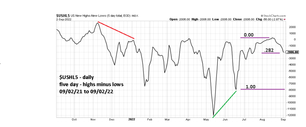 This chart illustrates the US new – highs minus lows (5 – day total; EOD) symbol ($USHLD).