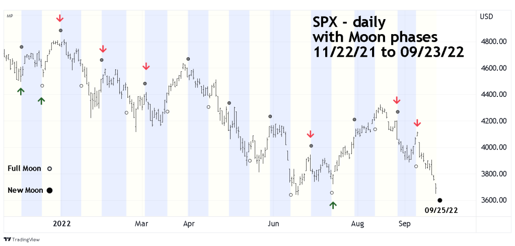 In stock markets, tops generally occurs on New Moons, bottoms at Full Moons. This theory is supported by the data on the chart. There were nine effective lunar turns. Of the six New Moon signals, five were tops one was a bottom. Of the three Full Moon signals two were bottoms one was a top. There’s a New Moon on 09/25/22. With US stock trending down into the plus or minus two trading day zone it implies a likely bottom.