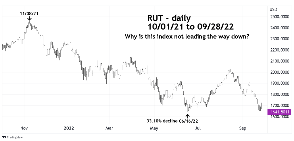 The RUT fell 33.10% from November 2021 To June 2022. These are small companies and should be very sensitive to adverse economic conditions. This index should be down much more than the large cap stock indices. Why is it not leading the way down?