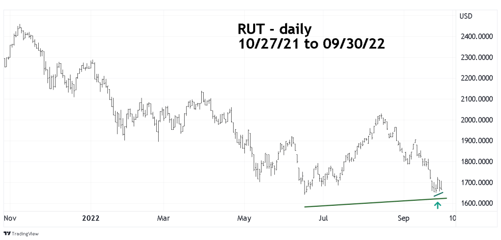 On 09/29/22 RUT held above its 09/27/22 bottom. On 09/30/22 RUT could not exceed even its 09/29/22 bottom. This is fascinating because RUT is composed of small cap stocks and at its June 2022 bottom was down 33.1% vs, 24.5% for the SPX.