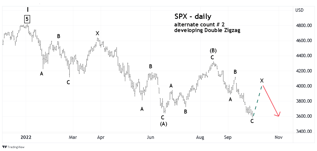Several blogs have noted the choppy nature of the SPX decline since January 2022. The bear market is taking the form of a complex corrective pattern, a Double Zigzag or even a Triple Zigzag. A Double Zigzag itself could be composed of a lower degree Double Zigzag . This composition could continue down to even lower degrees.