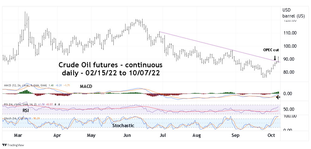 The daily chart of Crude Oil – WTI futures (Continuous: Next Contract in Front) courtesy of Trading View – symbol CL2! illustrates near-term action.