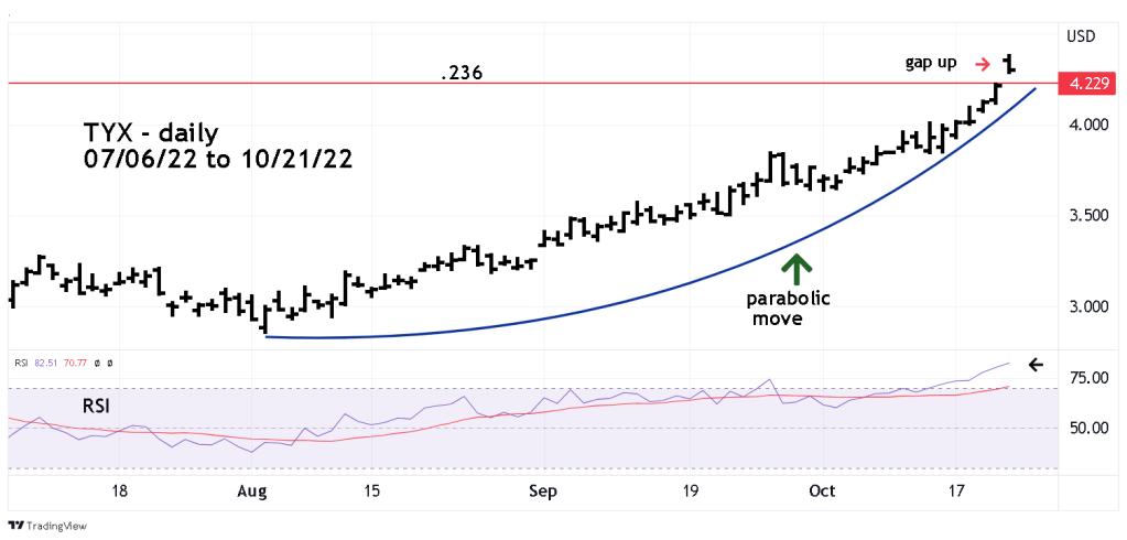 In August a parabolic rise began, then on 10/21/22 a huge gap up near the open of the trading session. TYX then trended lower for the rest of the day closing near the low. Yields/rates move inverse to bonds/notes. After months of the 30- year US Government Treasury bonds trending lower, 10/21/22 may have been a climactic burst of bond selling.