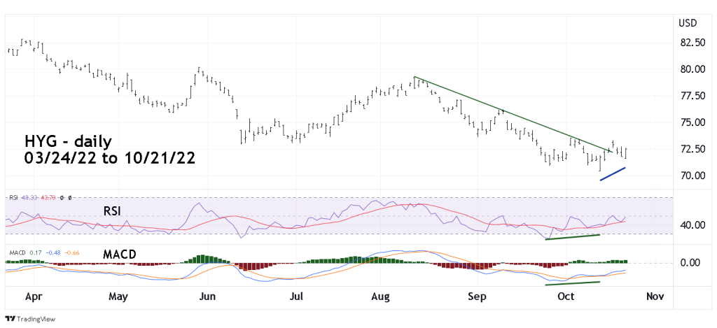 On 10/21/22 while TYX was making a new high, US Treasury bonds were making a new low. Yet HYG was decisively above its 10/13/22 bottom – also the same day the SPX bottomed. Note that going into the 10/13/22 bottom HYG also had bullish divergences on the RSI and MACD.