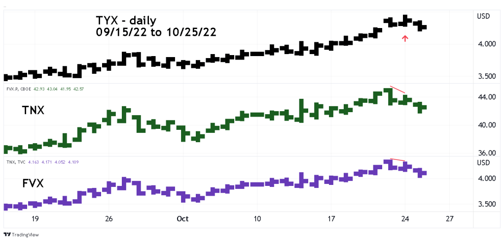 On 10/24/22 TYX made a marginal new high unconfirmed by TNX and FVX. Today 10/25/22 all three failed to make new highs and trended down