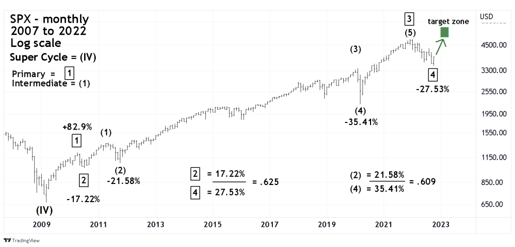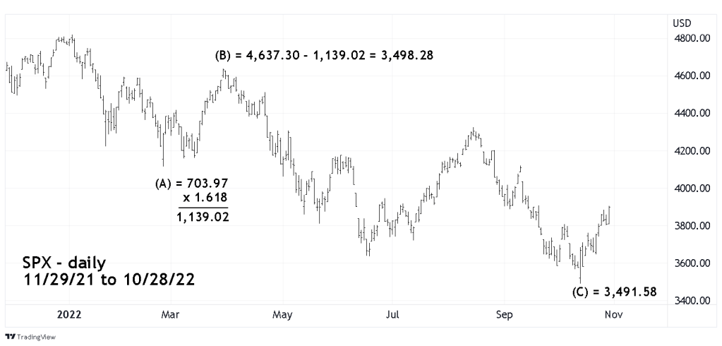 The Almanac used data from the DJI because it’s the oldest US stock index. While the DJI is a good index to use for analyzing Elliott waves and Fibonacci relationships, the S&P 500 (SPX) is better. The following three SPX charts courtesy of Trading View illustrate additional evidence that 2022 low for US stocks may have been made in October.